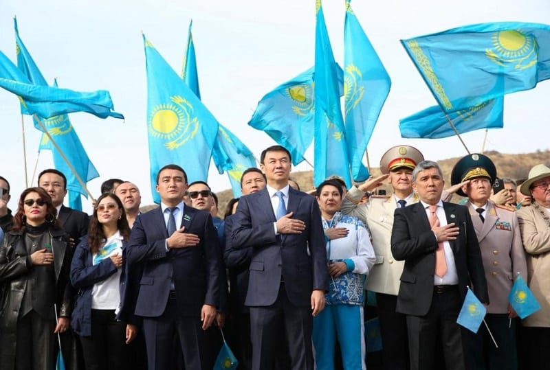 Көк байрақты көтеру рәсімінде дәстүр бойынша әскери-оркестрдің сүйемелдеуімен Мемлекеттік Әнұран шырқалды. Ту ілінген тұғырдың биіктігі – 40 метр, ал көлемі – 7×14 метр.