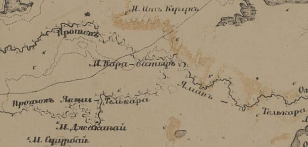 XIX ғасырдың екінші жартысында түсірілген тағы бір картада бастауларын батыстан алып, шығыс қарай ағатын Жаман Телқара мен Жақсы Телқара өзендерінің ортасында, аша тәрізденіп тоғысқан тақау тұстарында, «М. Кара-батырь» деп таңбаланған белгі бар, яғни бұл – «Қара батырдың моласы» деген сөз (Қараңыз: №3 карта). Ақтөбе облысына қарасты аудан орталығы – Ырғыздың (Жармола) солтүстік-шығыс жағында, 25-30 шақырымдай. Жұптасып қатар аққасын һәм сол төңіректегі жаңағы Қараның зиратымен байланыстырып, өзен атауын ел «тел Қара» атап кеткен. Осы жерге де әй жоқ, шәй жоқ «Бөкенбайдың әкесі Қарабатырдың мекені» деп жабысып жүр. Айтпағымыз, сонда Телқара өзені бойындағы Қара есімді Шөмекейдің батырының моласы қалайша оның қонысы болады?!