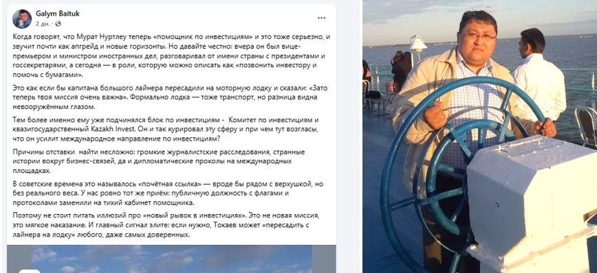 Қоғам белсендісі Ғалым Байтук өзінің Фейсбуктағы парақшасында Мұрат Нұртілеудің жаңа қызметіне қатысты ойымен бөлісіпті. Ол әлеуметтік желідегі жазбасында: «Кеше ғана елдің атынан президенттермен, мемлекеттік хатшылармен сөйлескен вице-премьер мен Сыртқы істер министрі бүгін инвесторға телефон шалып, құжат рәсімдеумен айналысатын көмекшіге айналды. Бұл – үлкен кеменің капитанын моторлы қайыққа отырғызып қойып, «миссияң маңызды» дегенмен бірдей», – деп мысал келтіріпті.